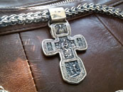 Изображено на кресте: Распятие Христово. Святая Троица. Святой Николай Чудотворец. Мученик Трифон. Три святителя. Икона Божией Матери "Толгская". Ангел Хранитель. Преподобный Сергий Радонежский. Святой Спиридон Тримифунский.1. Размер: 7 х 4 мм